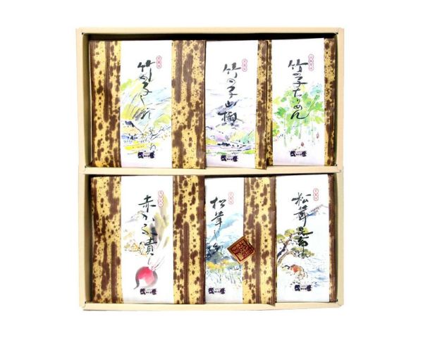 ・竹の子山椒(120g×1袋) ・竹の子しぐれ(120g×1袋) ・竹の子ちりめん(120g×1袋) ・松茸しぐれ(80g×1袋) ・松茸昆布(130g×1袋) ・赤かぶ漬(120g×1袋) |